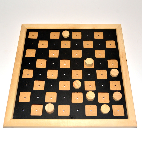 - во-вторых, 2 вида фигур (черные и белые) тактильно различимы между собой – один вид имеет круглую выпуклую шапочку, другие — с гладкой поверхностью. Шашка-дамка отличается от шашки высотой фигуры. Благодаря этому существенно упрощается процесс игры для людей с нарушенным зрением.