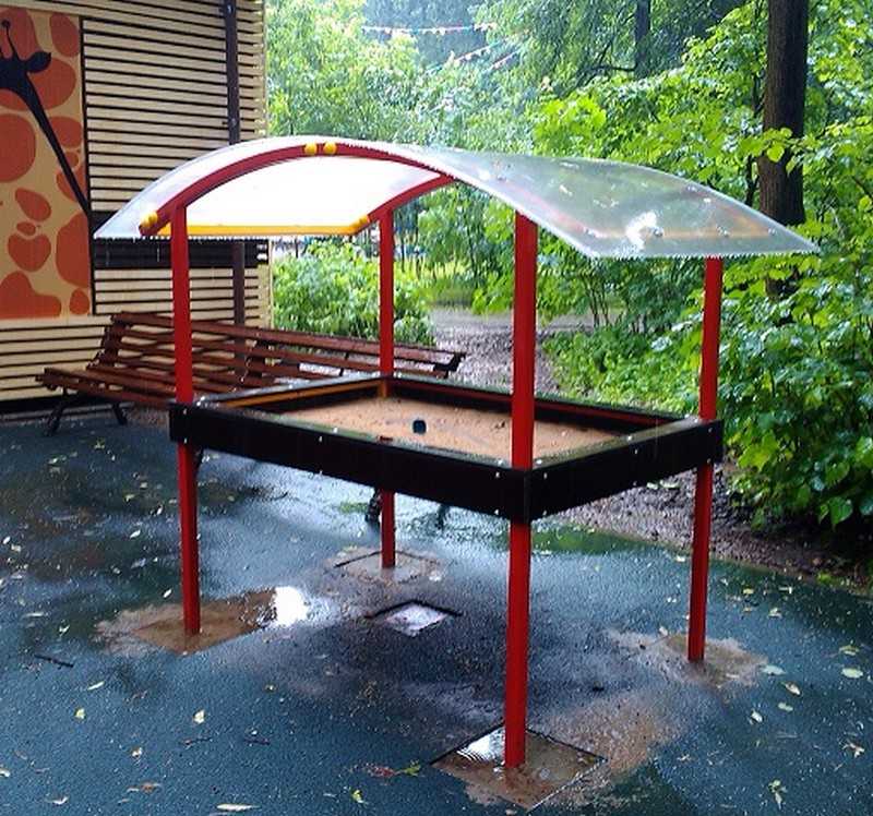 Стальная рама с полимерно-порошковой окраской, тело песочницы - влагостойкая ламинированная фанера, крыша - сотовый поликарбонат 6 мм.
