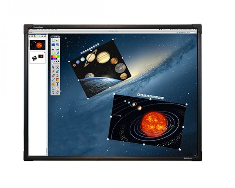Доска прямой проекции, позволяющая учителю и ученику одновременно работать с разнообразными учебными материалами и электронными уроками. Благодаря инфракрасной технологии, доска реагирует как на прикосновения маркерами, так и на управление пальцами, а специальное покрытие при необходимости позволяет использовать маркеры сухого стирания.