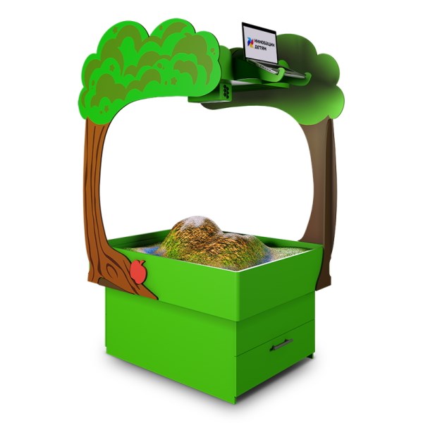 Это развивающий комплекс, который объединяет в себе возможности интерактивной песочницы и сенсорного стола. Технология дополненной реальности превращает обычный песок в земную поверхность с озёрами и горами, вулканами и долинами. Дополнительные панели позволяют проводить занятия в режиме сенсорного стола.