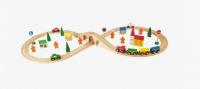 Набор содержит 49 деревянных деталей, включая рельсы, поезда, машины, здания, дорожные знаки, деревья, фигурки людей, мост и арку.