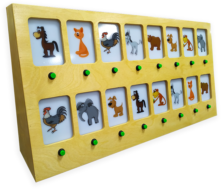 На лицевой панели расположены две группы по 8 кнопок, над каждой из которых изображения различных животных и птиц (слон, собака, осёл, петух, обезьяна, лошадь, кошка и медведь). Изображения повторяются в каждом ряду, но в различном порядке.
