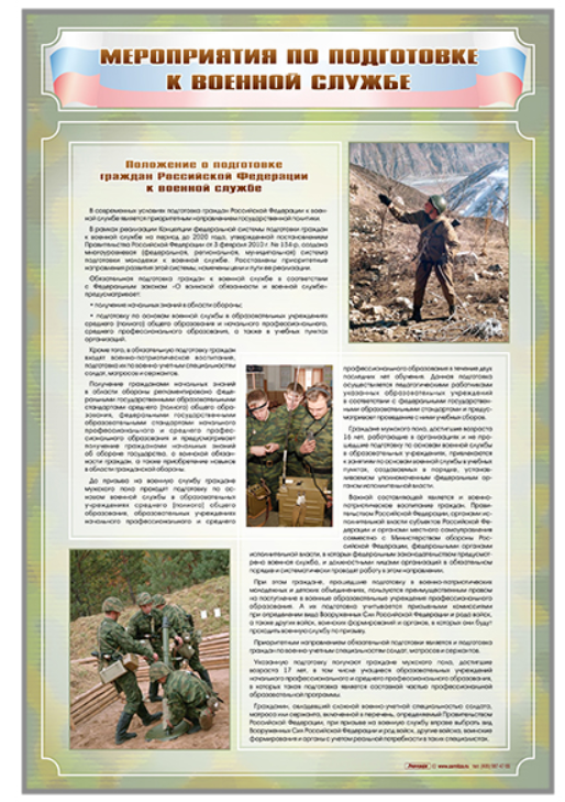 Стенд представляет собой информационную панель, на которой размещена выдержка из "Положения о подготовке граждан Российской Федерации к военной службе".