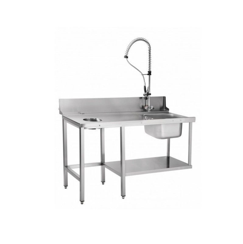 Стол предмоечный СПМП-6-5 имеет отверстие для сбора крупных отходов, цельнотянутую ванну для предварительного ополаскивания посуды (400х400х300 мм), душирующее устройство для холодной и горячей воды, регулируемые по высоте ножки. Крепление к посудомоечной машине осуществляется с помощью верхнего зацепа и нижних винтов. Путем несложного монтажа стол можно установить как в левом, так и правом исполнении.