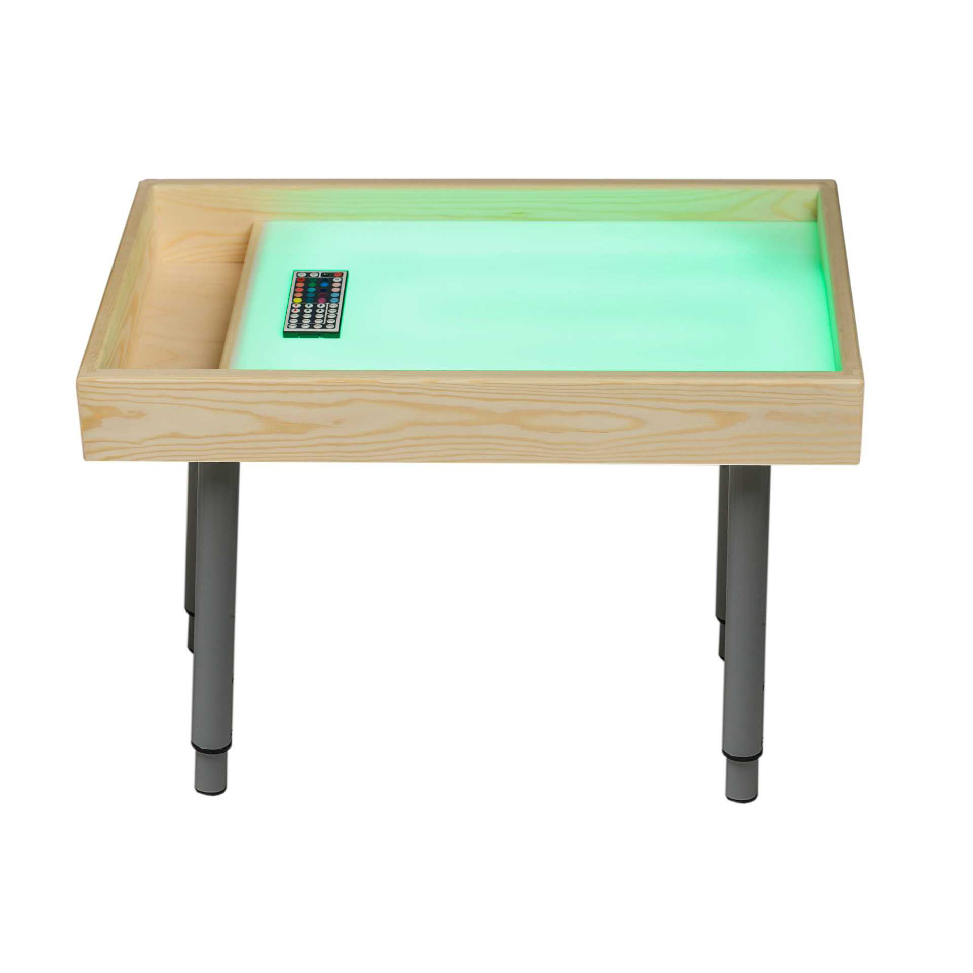 Корпус стола выполнен из массива сосны, внутри специальный отсек для хранения, а наличие боковых бортиков предотвращает высыпание песка наружу. Поверхность для рисования выполнена из безопасного оргстекла. Имеется регулируемая по яркости 16-цветовая подсветка с пультом управления. Регулируемые по высоте ножки позволят скорректировать высоту стола в соответствии с ростом ребенка.