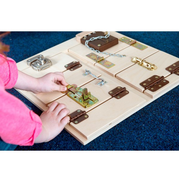 Тактильно-развивающая панель состоит из нескольких дверок с различными видами замков и щеколд. Панель предназначена для развития мелкой моторики, развития осязательных навыков, освоения алгоритмов открывания и закрывания. Панель выполнена из высокопрочного дерева и имеет специальное настенное крепление.