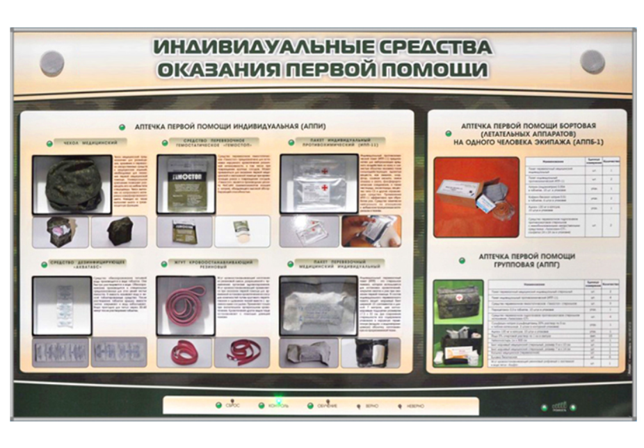 Интерактивный стенд представляет собой полноцветную информационную панель с комбинированной световой индикацией. На стенде представлена информация по составу аптечки первой помощи индивидуальной, аптечки первой помощи бортовой и аптечки первой помощи групповой. В лицевую панель интегрированы реальные образцы аптечки первой помощи индивидуальной. В конструкцию учебного оборудования интегрированы высокочувствительные сенсоры для управления стендом при помощи интерактивного магнитного воздействия приемо-передающих устройств во время обучающего процесса и проведения тестовых заданий.