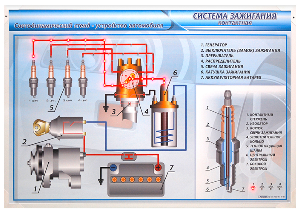 Электрифицированный светодинамический стенд представляет собой информационную панель с раздельной секционной светодиодной индикацией, на которой изображена схема контактной системы зажигания автомобиля.