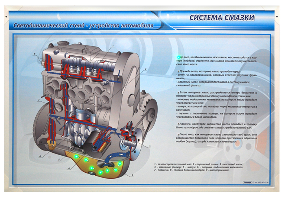 Электрифицированный светодинамический стенд представляет собой информационную панель с раздельной секционной светодиодной индикацией, на которой изображена схема системы смазки автомобиля.