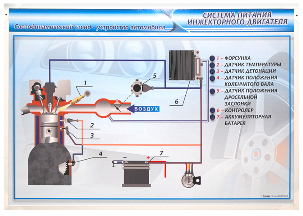 Электрифицированный светодинамический стенд представляет собой информационную панель с раздельной секционной светодиодной индикацией, на которой изображена схема системы питания инжекторного двигателя автомобиля.